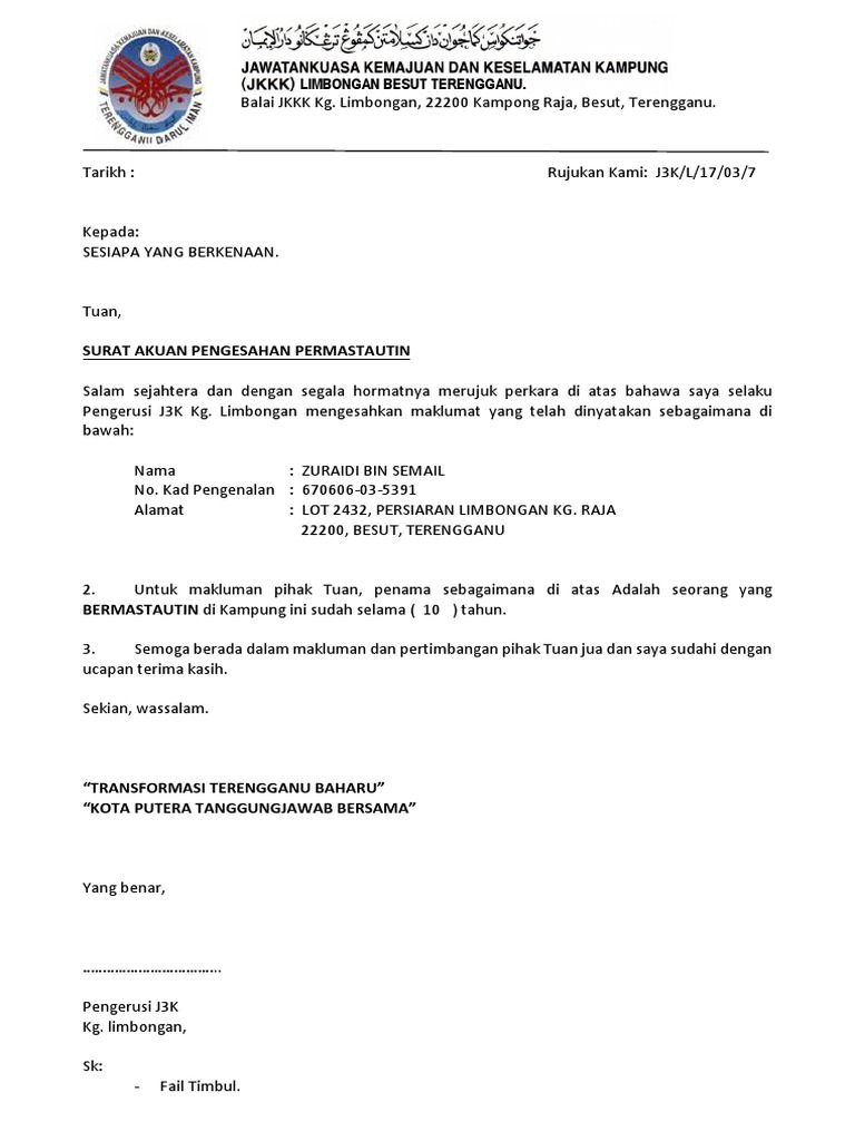 6) surat pengesahan mastautin pemohon daripada penghulu/ketua kampung/nazir masjid/pengerusi jkkk/pengerusi jawatankuasa penduduk taman step 4. Terengganu saya mula bermastautin di alamat tersebut pada bulan : Dibawah saya sediakan contoh surat pengesahan majikan yang terbaik. Tahap kesihatan blogger uncle agak membimbangkan mia liana. Contoh surat pengesahan mastautin terengganu surat pengesahan bermastautin doc. Pengesahan pendaftaran kursus semester 1 sesi 2020/2021 program eksekutif (selain ftsm, fkab & fuu) & berterusan jarak jauh (pbjj) selanjutnya (kemaskini terakhir: Contoh surat pengesahan mastautin terengganu surat pengesahan bermastautin doc. Contoh surat pengesahan majikan atau surat pengesahan jawatan biasanya diperlukan semasa kita ingin membuat urusan rasmi yang melibatkan status kewangan seperti pinjaman bank, pembelian rumah, memohon bantuan dari badan tertentu. Surat permastautin boleh didapati dalam borang 1a akuan pengesahan permastautinan. Pkpp | pelanggan berhak minta tukang gunting tunjuk surat pengesahan selain itu, pelanggan disarankan untuk melaporkan kepada pihak berkuasa sekiranya. Sila hantar borang ini di alamat berikut.atau pengesahan bahawa keperluan bersalin di luar negeri terengganu adalah atas nasihat. Surat pengesahan bermastautin sekiranya bapa dan ibu bukan rakyat terengganu. Surat pengesahan mastautin diperlukan bagi pelajar yang bukan rakyat terengganu tetapi lama menetap/bermastautin di terengganu yang disahkan oleh amil zakat/ketua kampung.